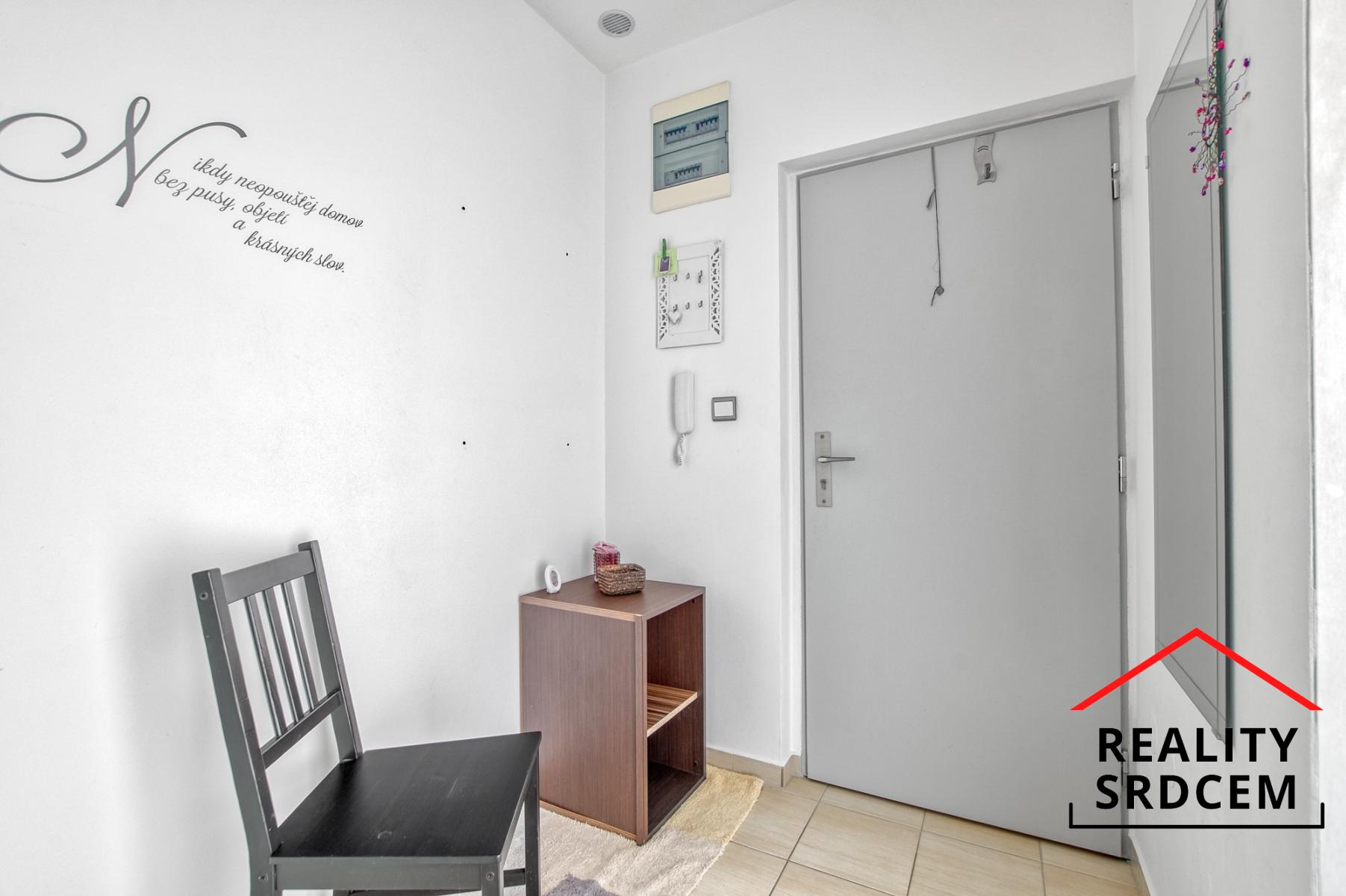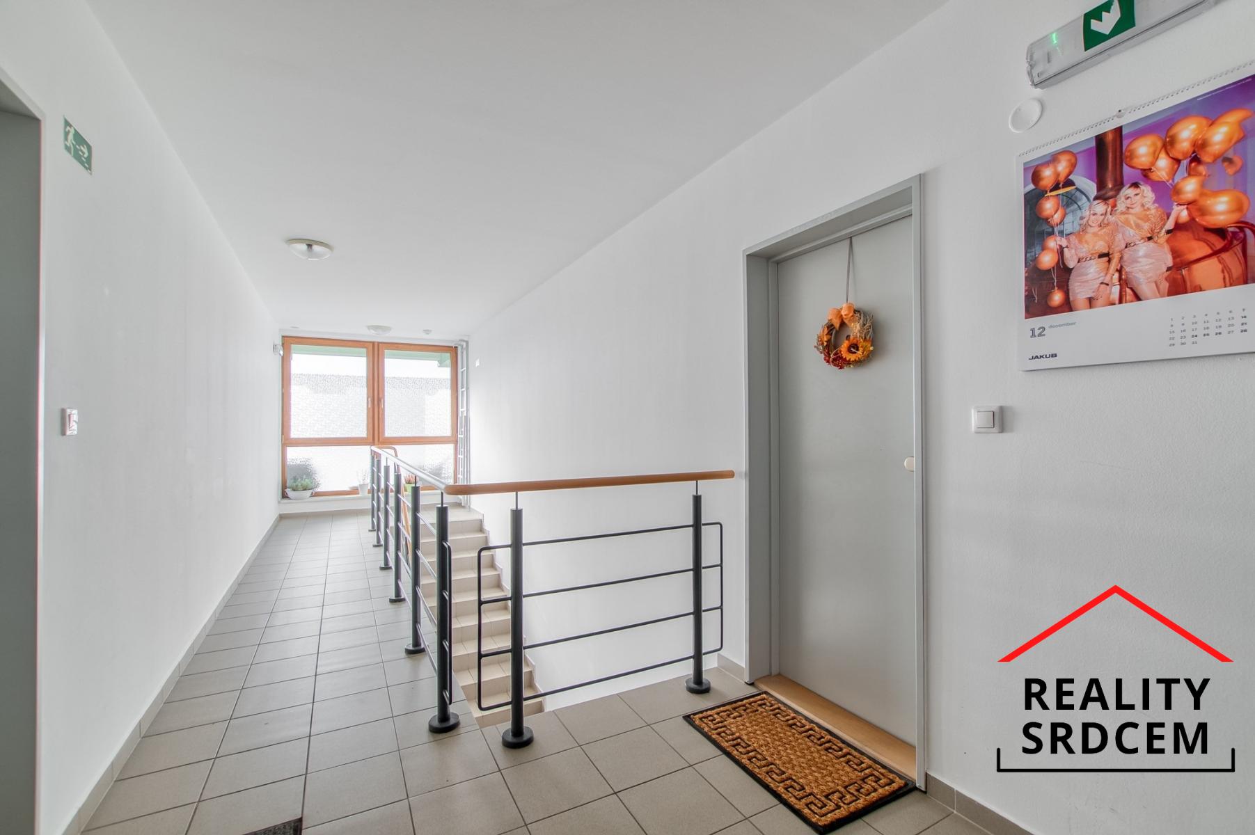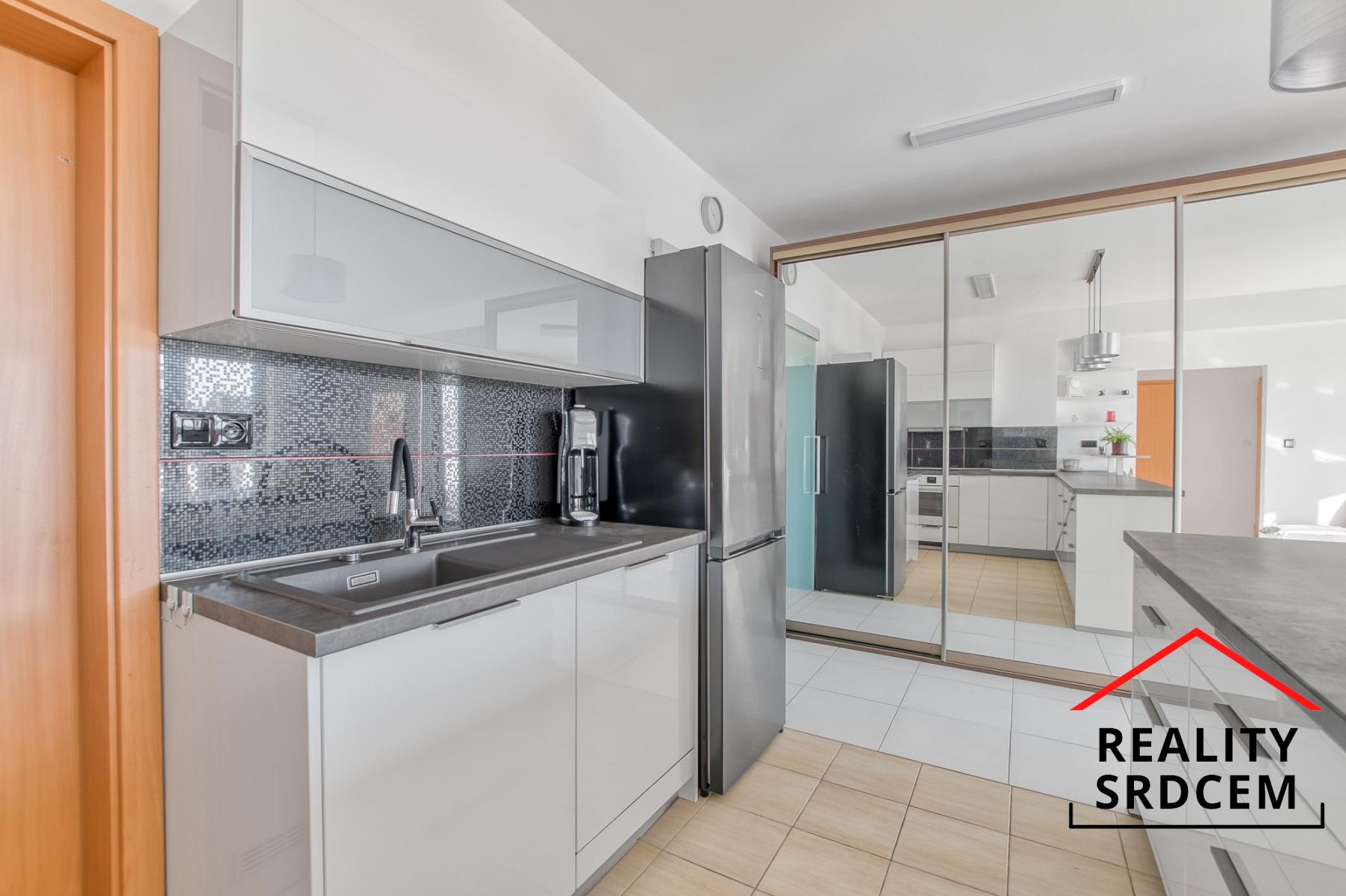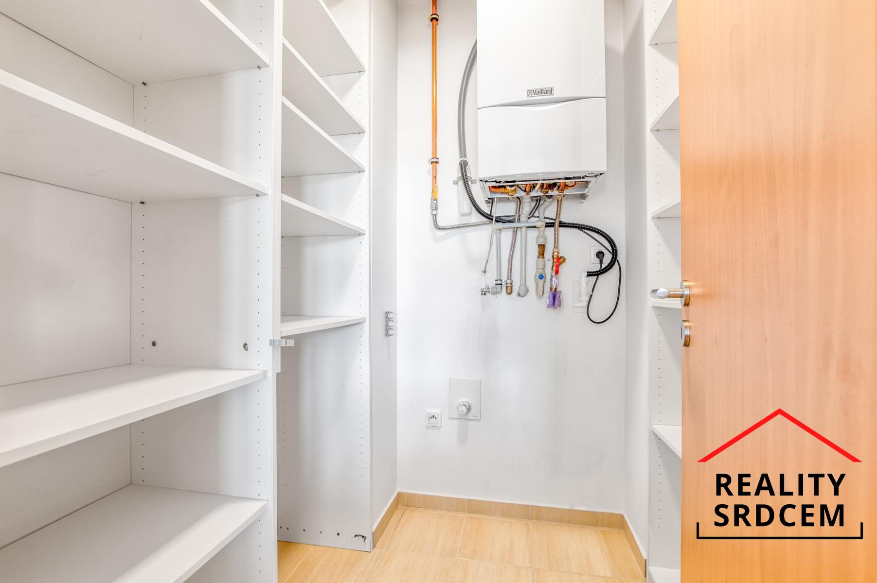 K vybavení patří kuchyňská linka s vestavěnými spotřebiči (myčka, trouba, varná deska, digestoř) a prostorná zrcadlová šatní skříň, která nabízí dostatek úložného prostoru. Součástí prodeje je také společná komora přímo na patře. Vytápění i ohřev vody zajišťuje vlastní plynový kotel (kombinace podlahového vytápění a radiátorů). Byt celkově působí velmi moderním a pěkným dojmem.