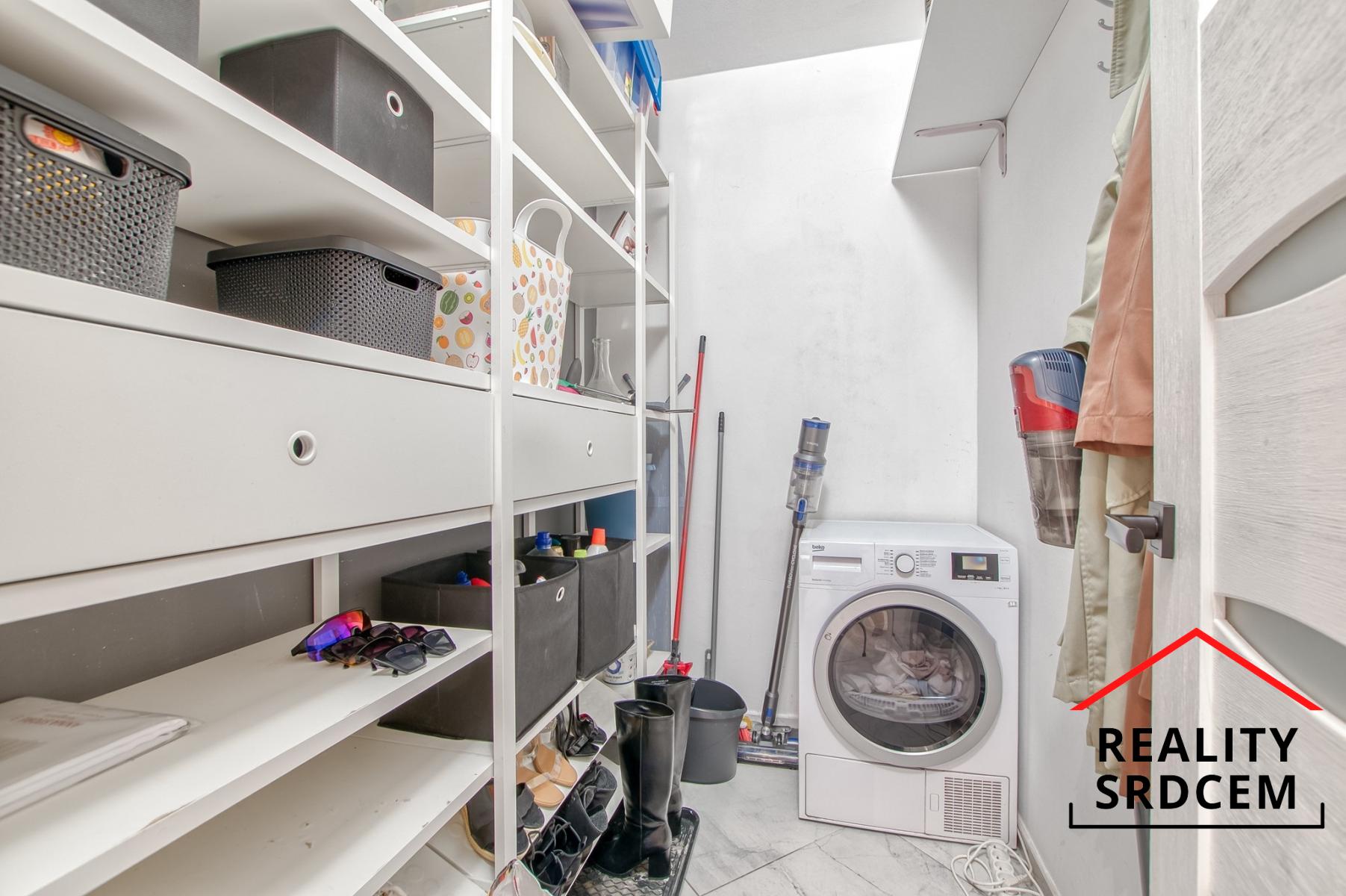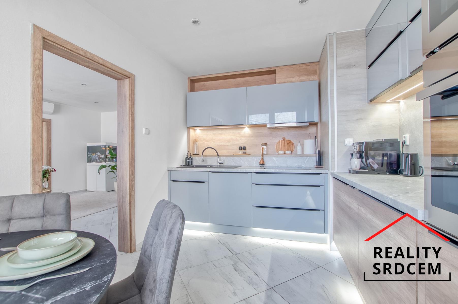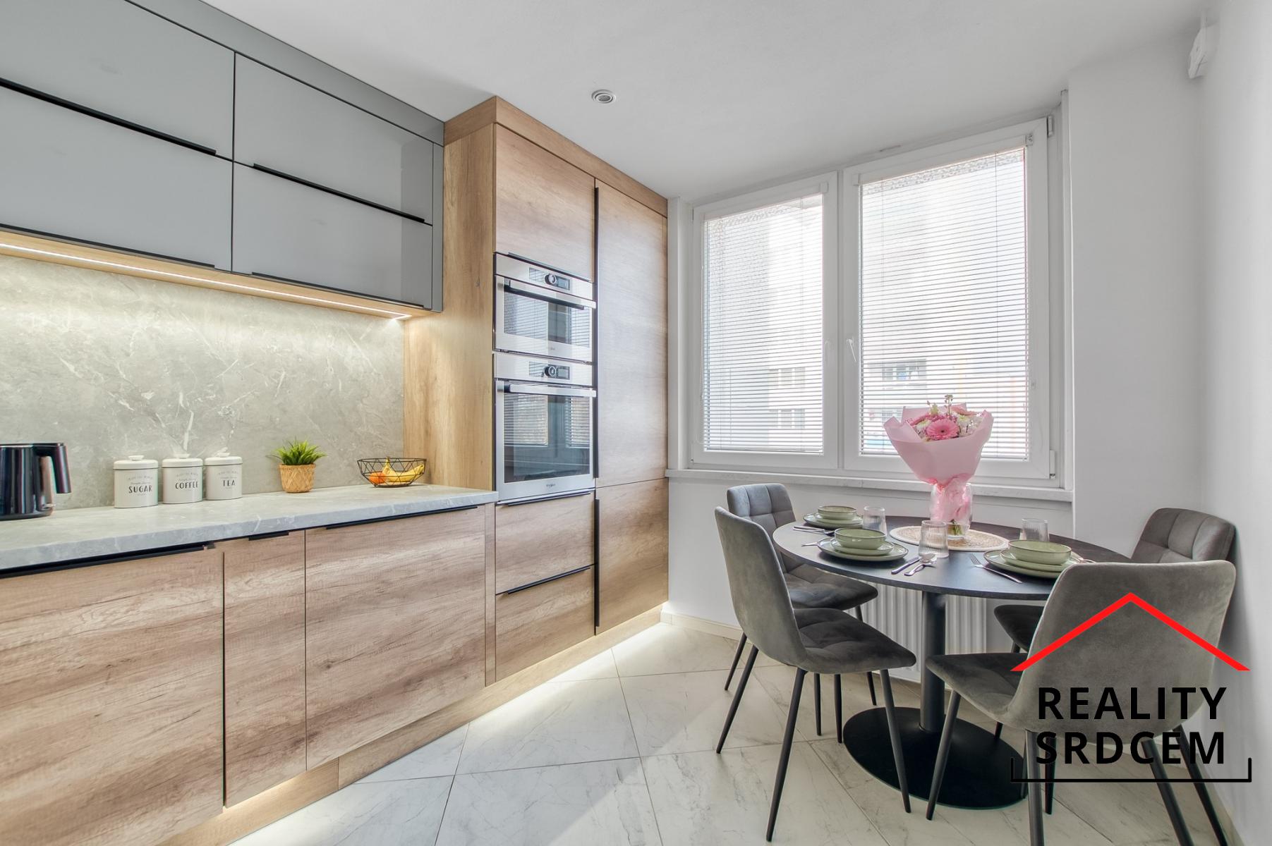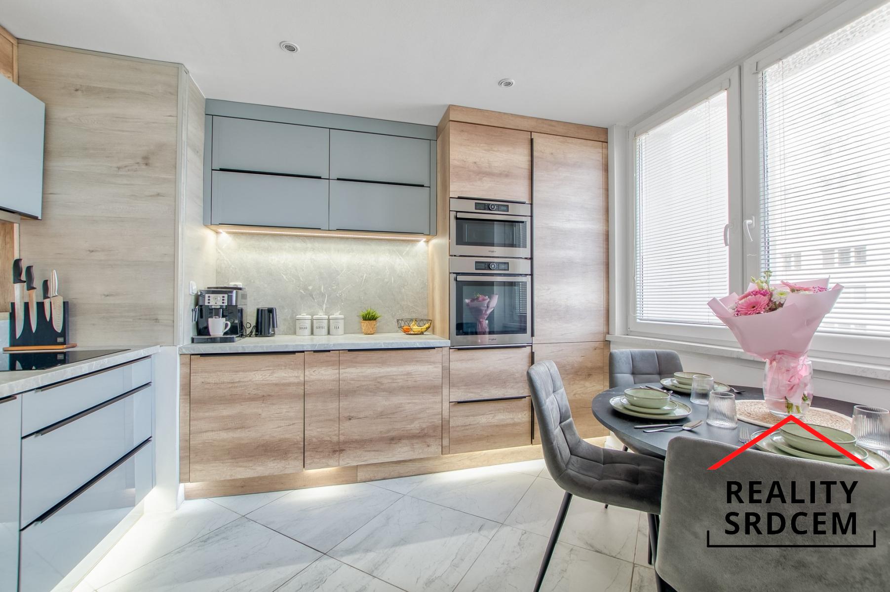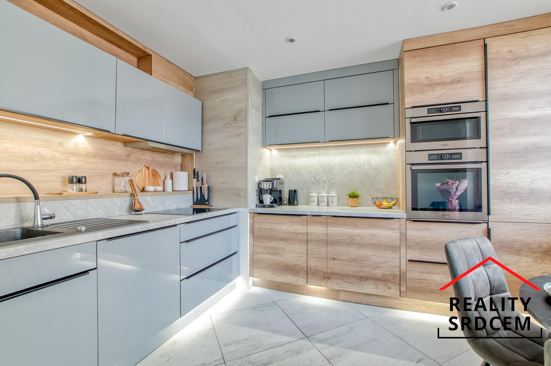 Dominantou bytu je moderní kuchyňská linka vyrobená na míru, která je vybavena vestavěnými spotřebiči a poskytuje dostatek pracovního i úložného prostoru. Praktickým benefitem je také samostatná šatna, která výrazně zvyšuje komfort každodenního bydlení.