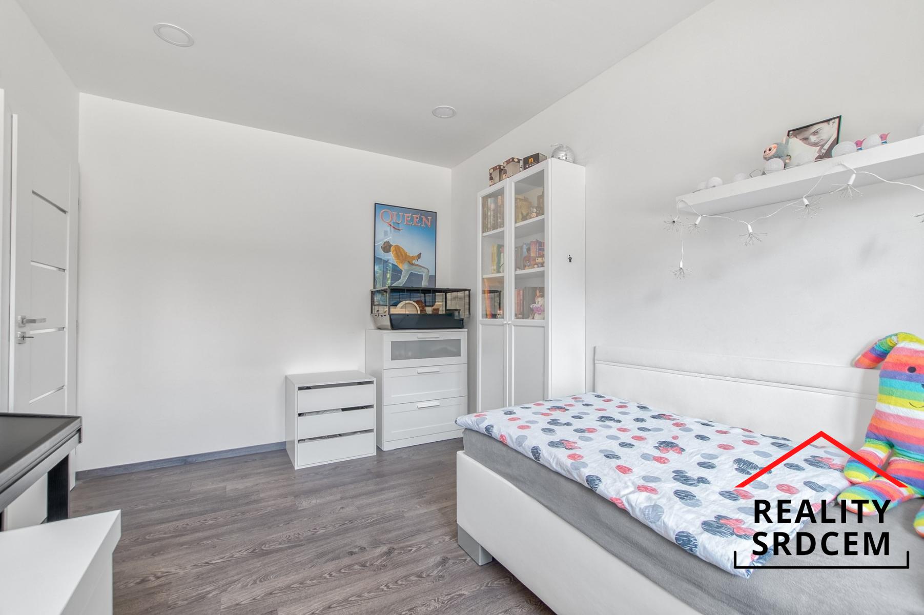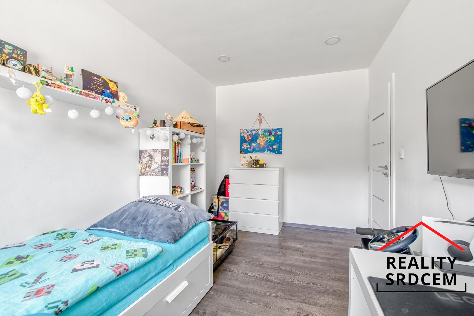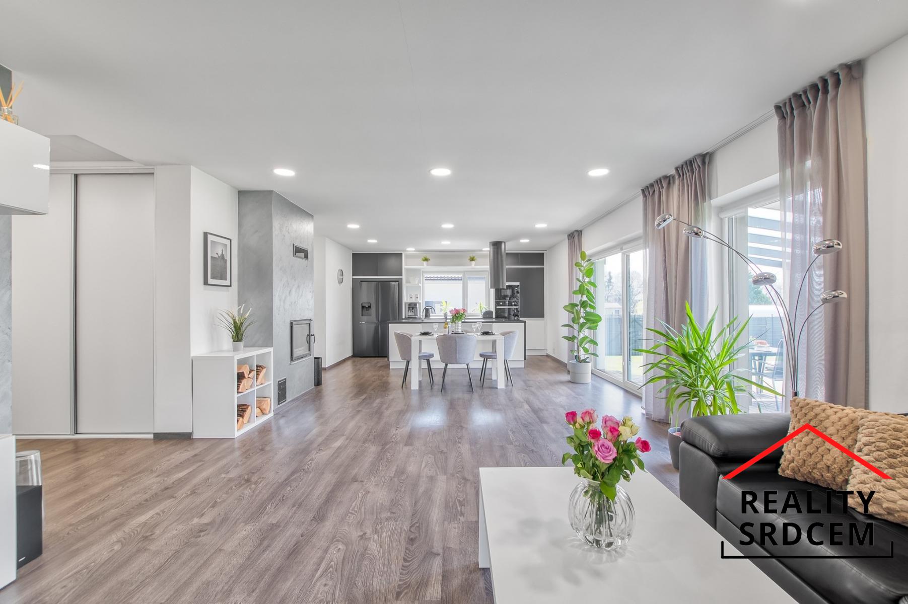 U vstupu je praktická předsíň, na kterou navazuje vstupní chodbička s vestavěnou šatní skříní. Dominantu tohoto domu tvoří obývací pokoj spojený s kuchyní o velikosti 59 m2 - prostě centrum rodinného života, kde nechybí krb, klimatizaci ani výstup na terasu. Dva dětské pokoje jsou samostatně řešené a mají vlastní koupelnu s vanou i toaletou. Ložnice je zázemí Vašeho klidu. Nechybí šatna, ani vlastní koupelna se sprchou a toaletou, a místa je tady dostatek.