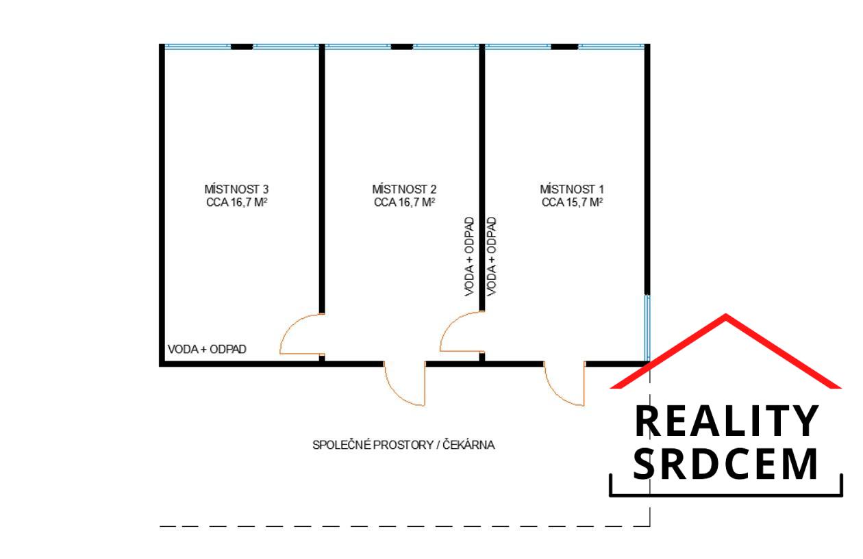 Nabízíme k prodeji prostory umístěné ve 2NP v cihlové budově na ulici 1. československého armádního sboru v Ostravě - Porubě. Prostory jsou složené ze 3 přibližně stejně velkých místností orientovaných do klidné části dvora na jihovýchod. První místnost má cca 15,7 m2 (2,70 x 5,85) je zde vstup ze společných prostor čekárny stejně jako do druhé místnosti o velikosti 16,7 m2 (2,85 x 5,85), která je průchozí do třetí místnosti o stejné velikosti 16,7 m2 (2,85 x 5,85). Všechny místnosti mají možnost připojení vody a odpadu.