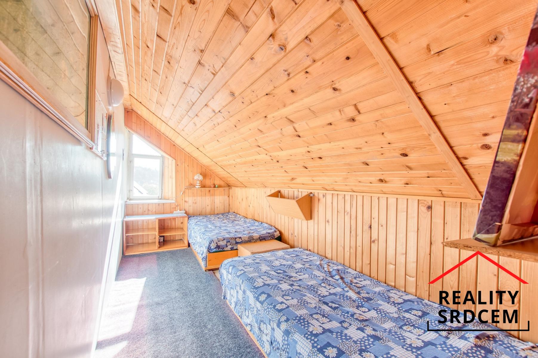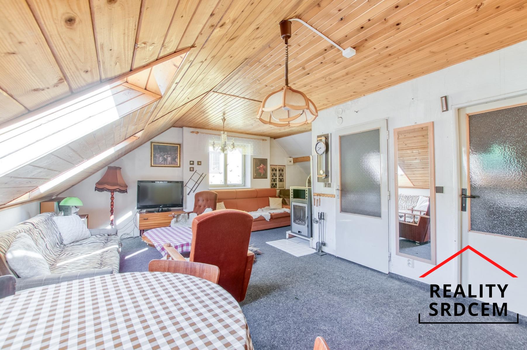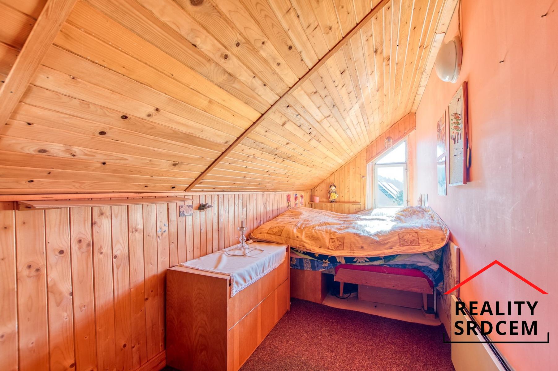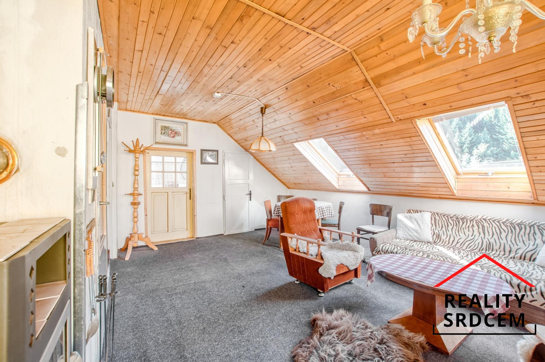 Do podkroví se dostaneme po schodišti, kde hlavním prostorem je druhý obytný pokoj s krbem. Dále je zde další ložnice, menší koupelna s vanou a toaletou a v šikminách jsou dva menší pokoje, které se nyní využívaly pro přespání. Nemovitost se v posledních letech využívala převážně k rekreačnímu bydlení, ale dokáže nabídnout po modernizacích příjemné bydlení.