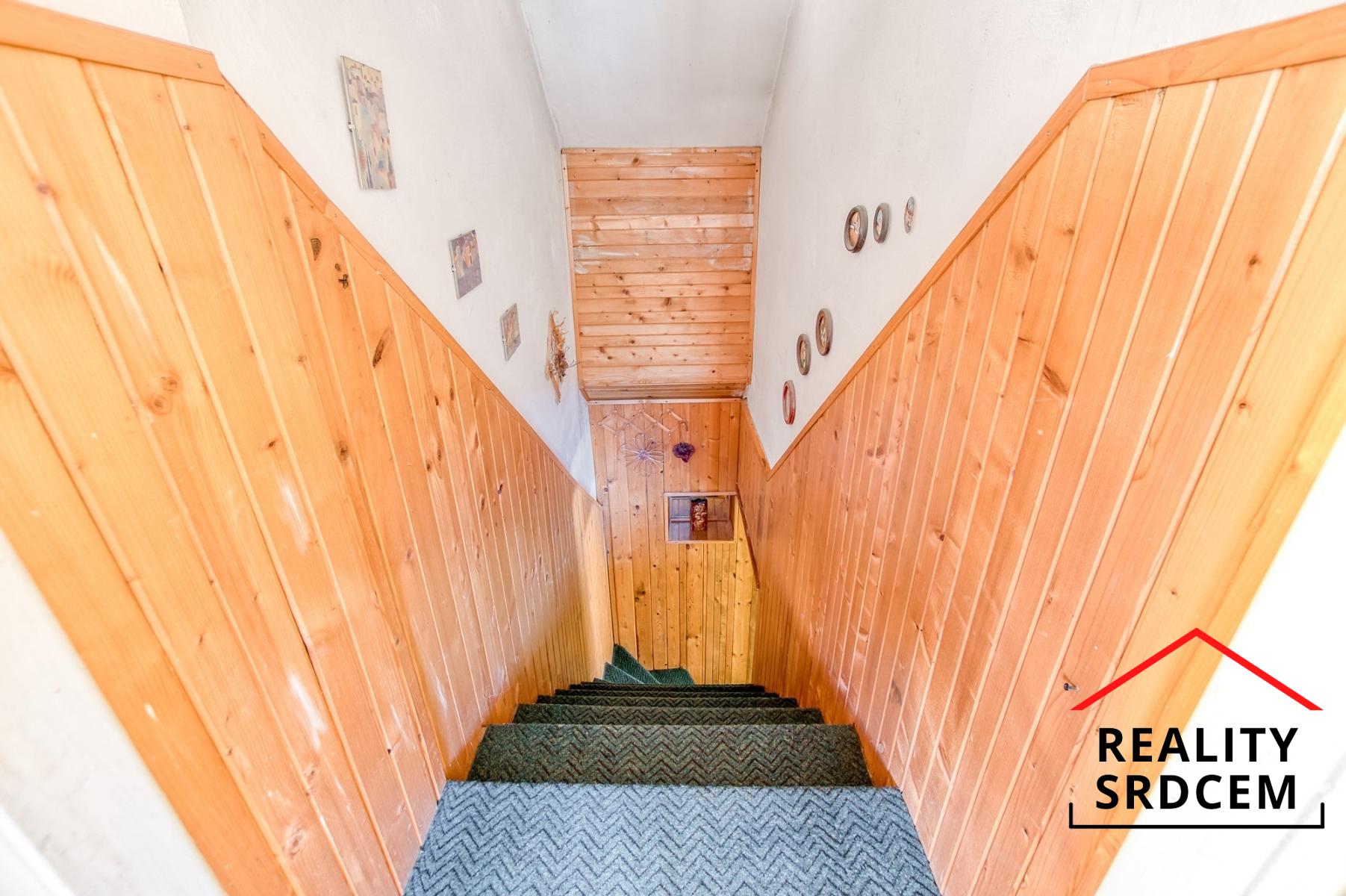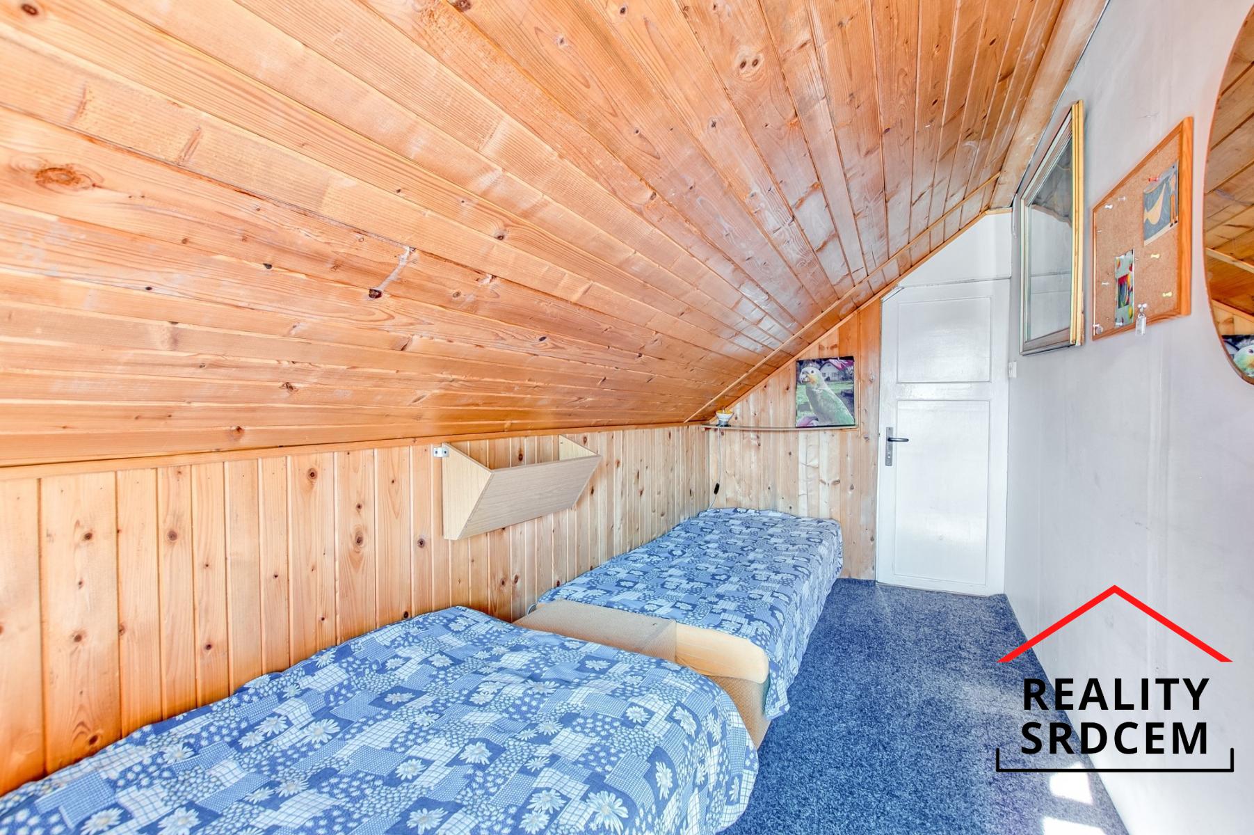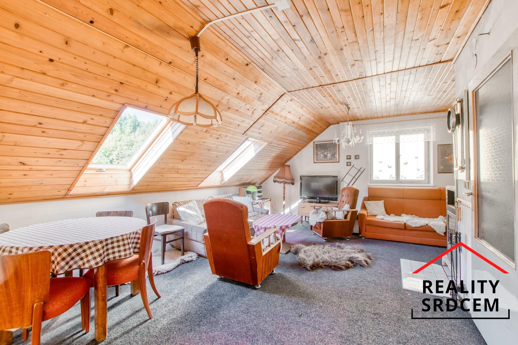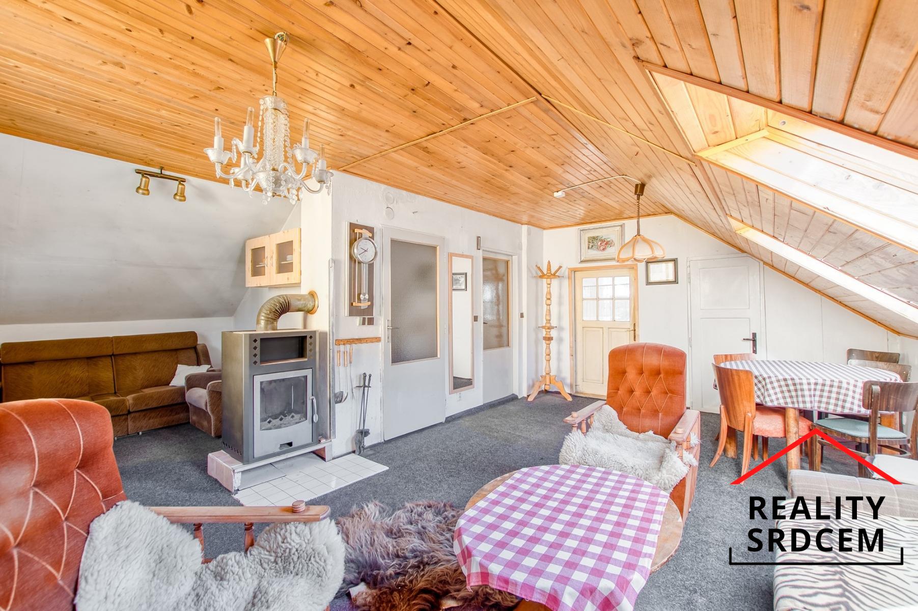 Do podkroví se dostaneme po schodišti, kde hlavním prostorem je druhý obytný pokoj s krbem. Dále je zde další ložnice, menší koupelna s vanou a toaletou a v šikminách jsou dva menší pokoje, které se nyní využívaly pro přespání. Nemovitost se v posledních letech využívala převážně k rekreačnímu bydlení, ale dokáže nabídnout po modernizacích příjemné bydlení.