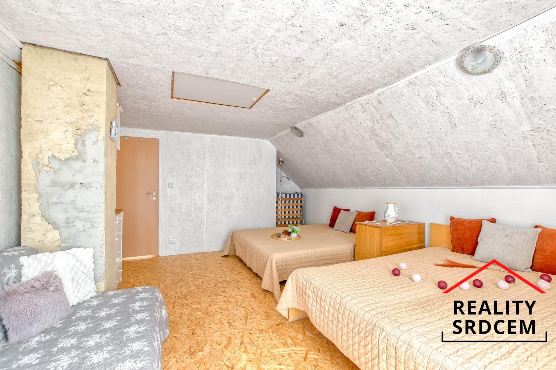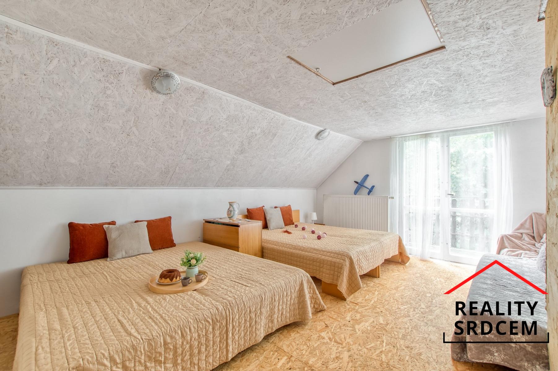 Dole život a nahoře relax. V podkroví, do kterého se dostanete ze stávající jídelny, jsou totiž dvě ložnice. Jedna tak akorát a druhá obrovská, takže celá chata pojme i 10 lidí na komfortní přespání. A samozřejmě nechybí menší půdní prostor na uložení věcí. Celkově pohodových 91 m2 plochy.