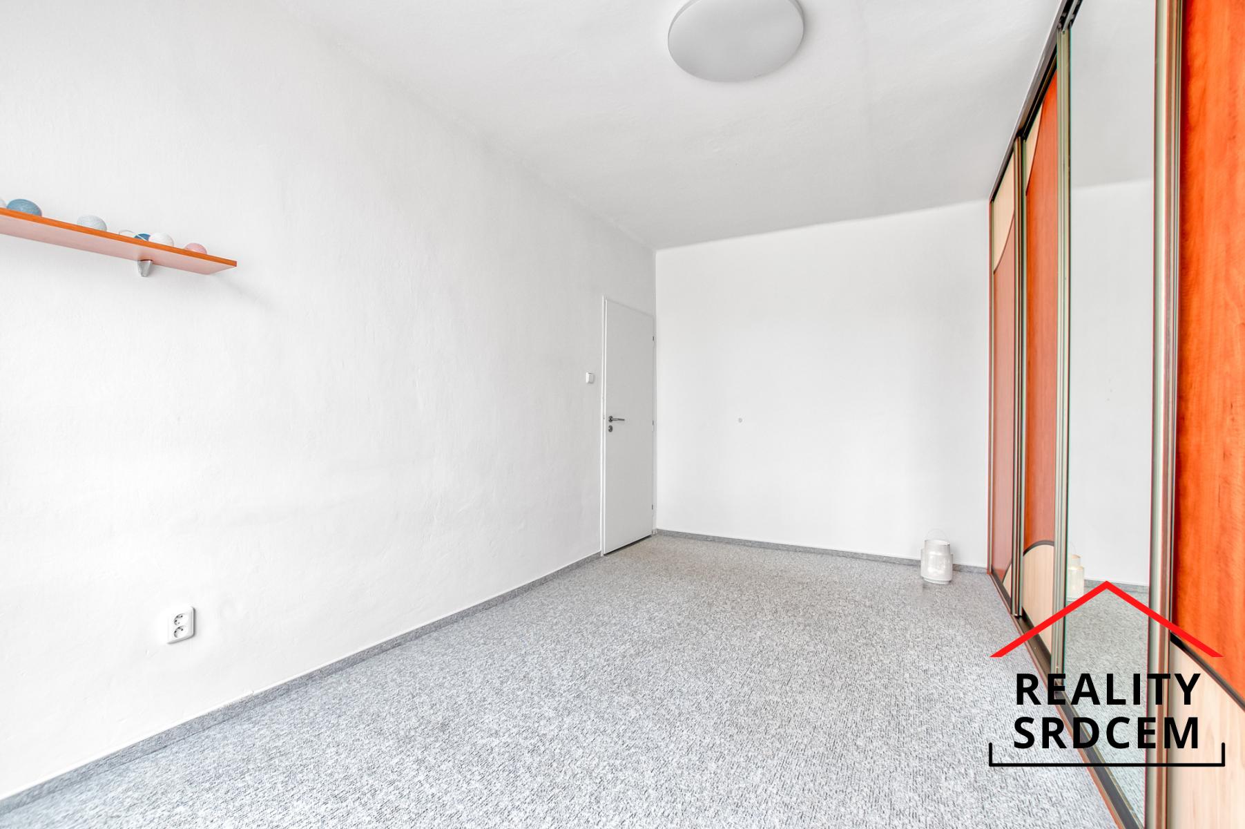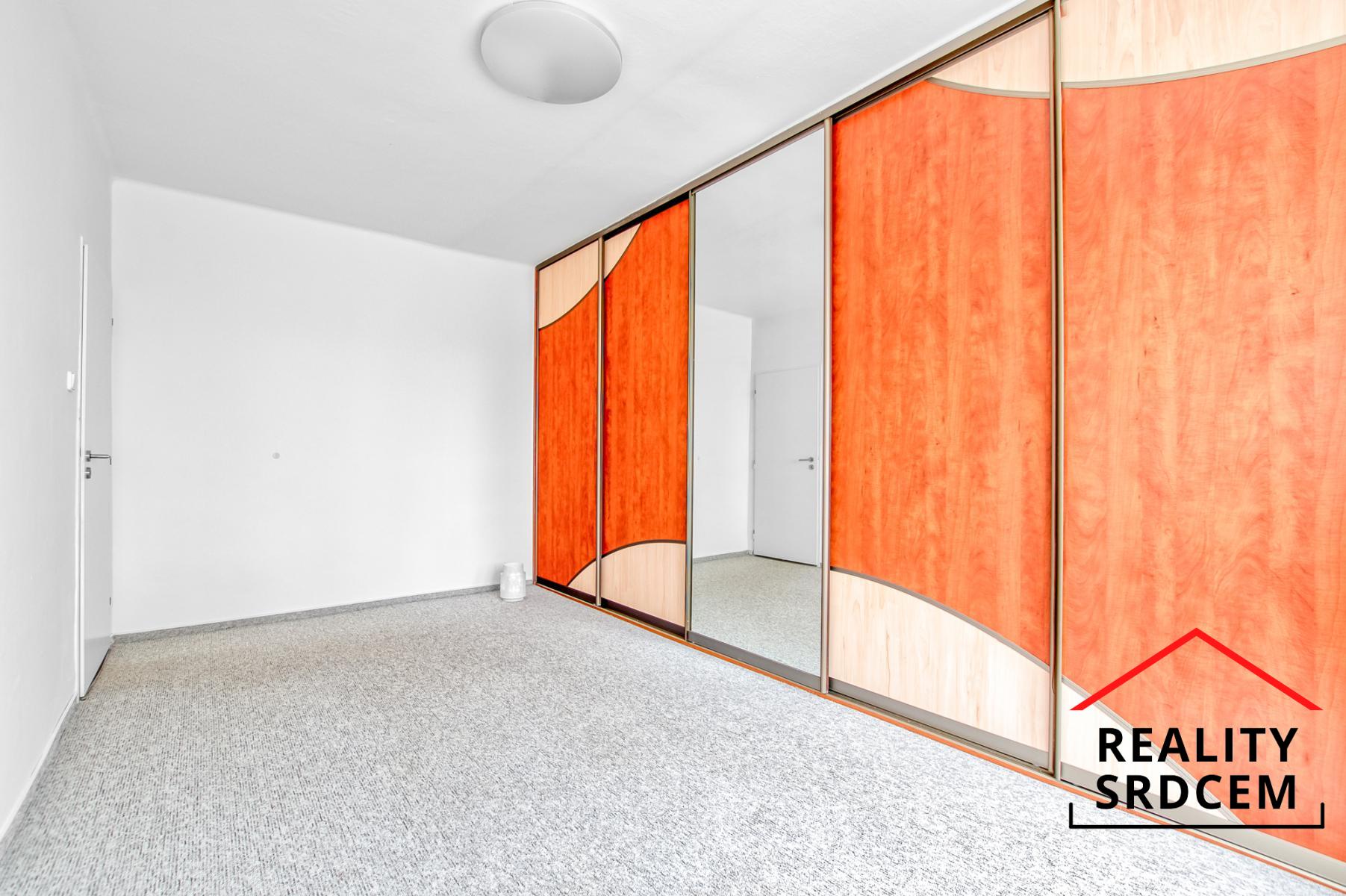Ložnice nabízí velké množství úložného prostoru ve vestavěných skříních, což ocení každý, kdo má rád pořádek a přehled. Postel si můžete zvolit podle vlastních představ. Na podlaze je koberec, který místnosti dodává pocit tepla a útulnosti.