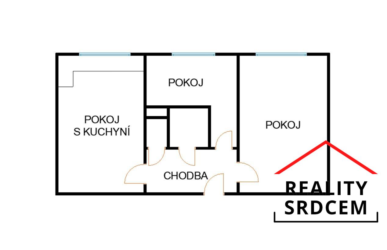 Byt je dispozičně řešen jako 3+kk - kuchyň s obývacím pokojem, jeden prostorný samostatný pokoj a druhý menší pokojík.